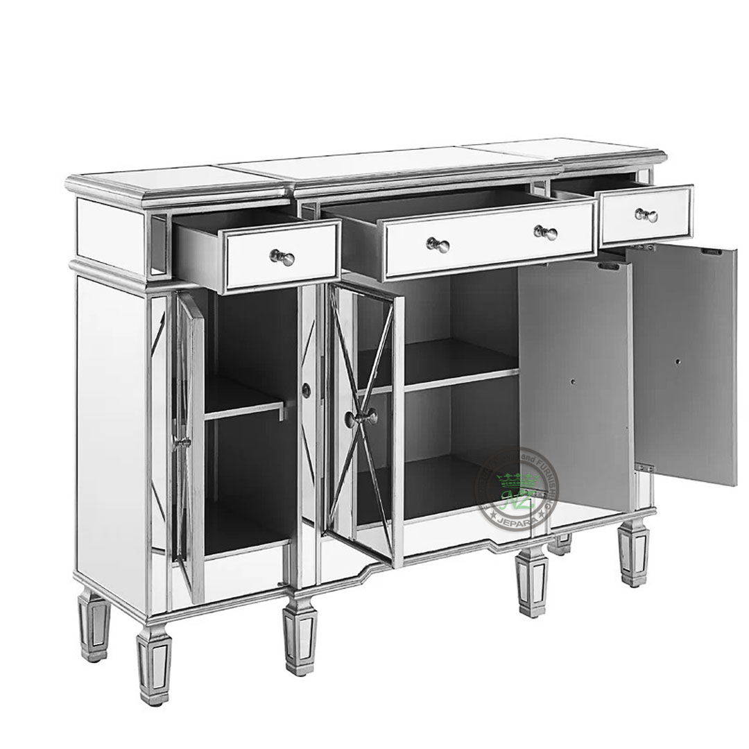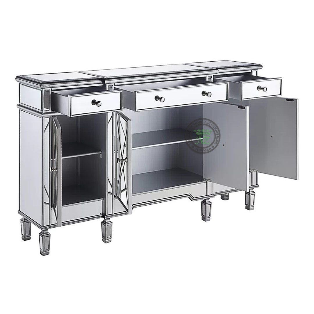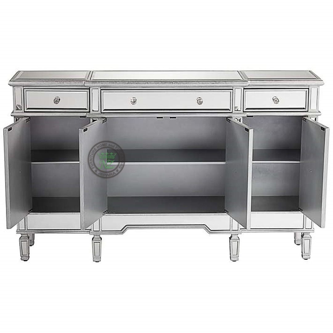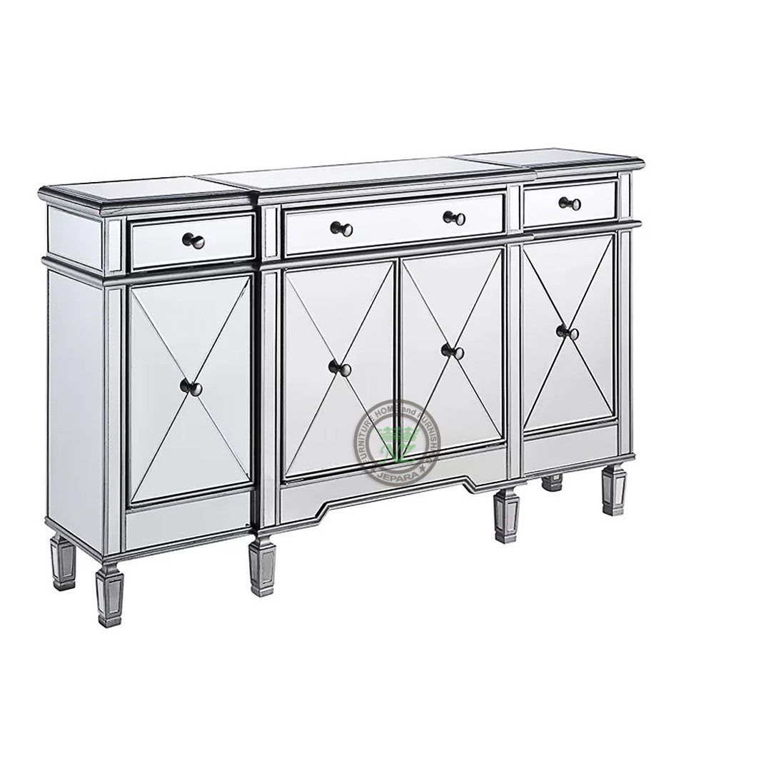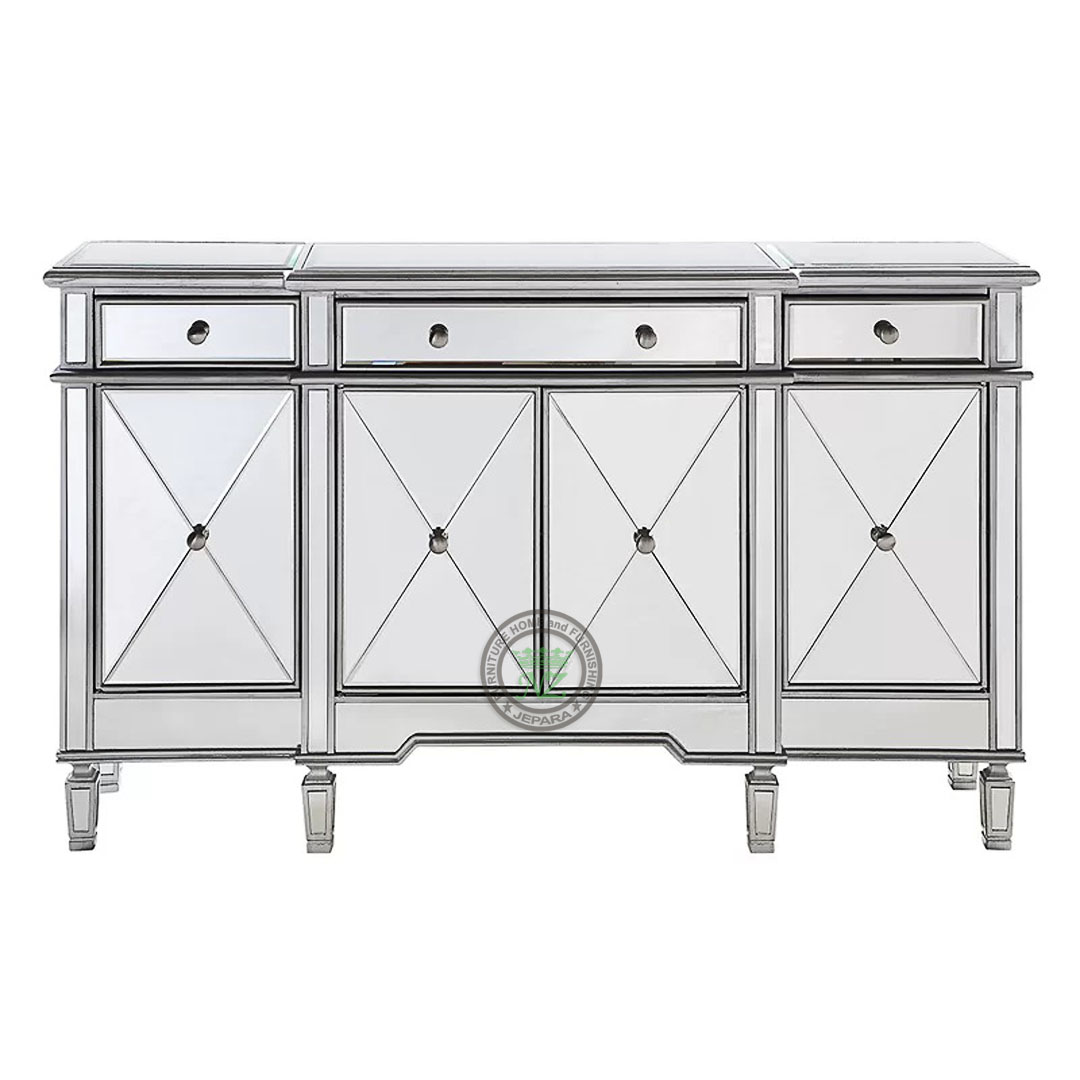 Tampil glamour dengan bufet kaca cermin yang menarik ini! Desain klasik dibuat dari kayu solid mahoni dan buatan tangan pengrajin kami di Jepara, kemudian diberi pembaruan aksesoris yang tak terduga dari panel kaca cermin, membuat produk ini menarik perhatian bagi yang melihatnya.
