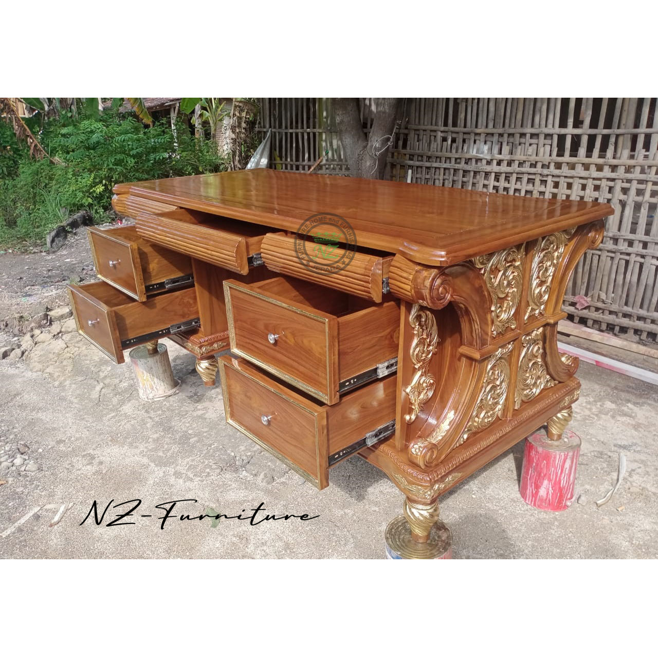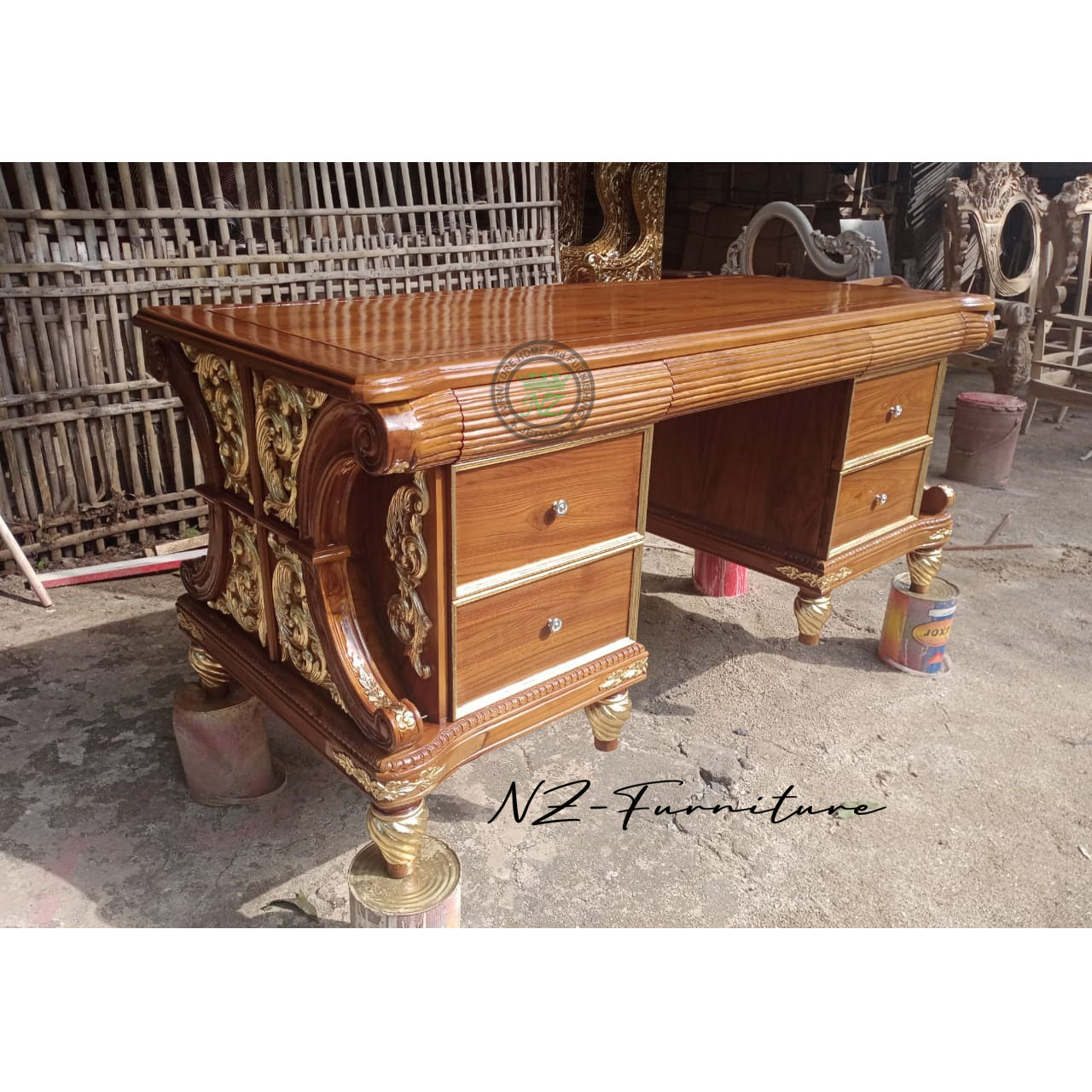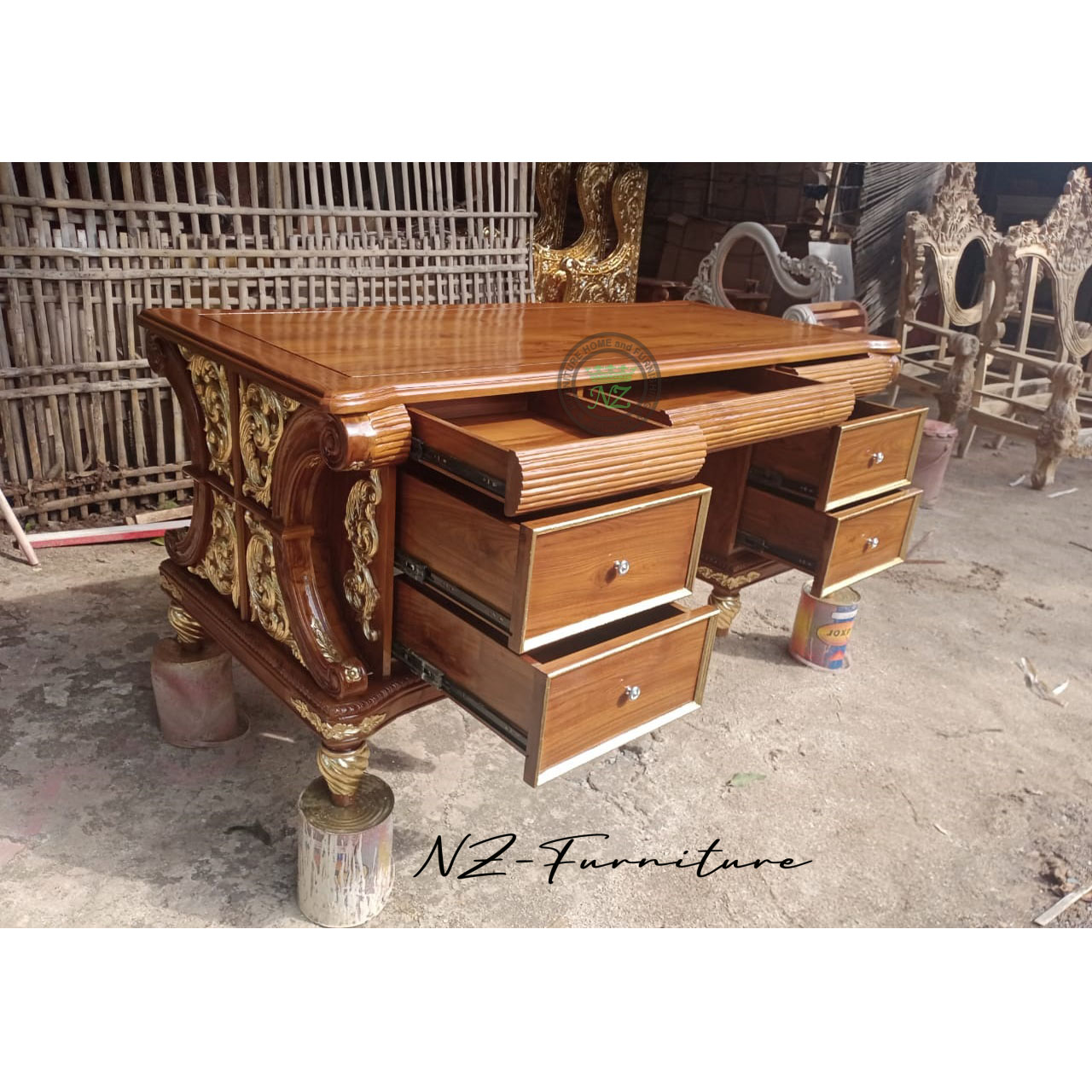 Meja Kantor Love Collection adalah gaya, keindahan, dan kenyamanan yang halus. Terbuat dari kayu jati solid, buatan tangan dari pengrajin jepara dengan warna walnut dengan aplikasi daun emas dan tuju laci membuat meja ini sangat lengkap untuk menyimpan dokumen penting Anda.
