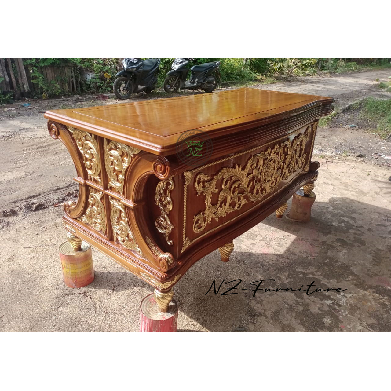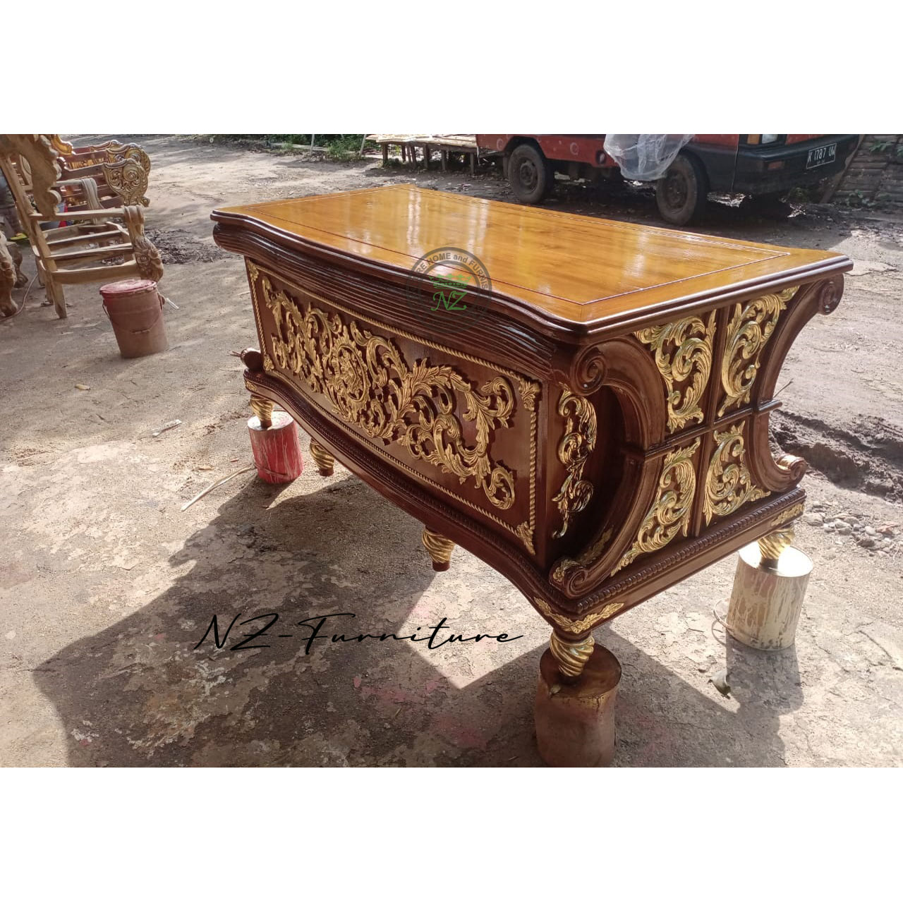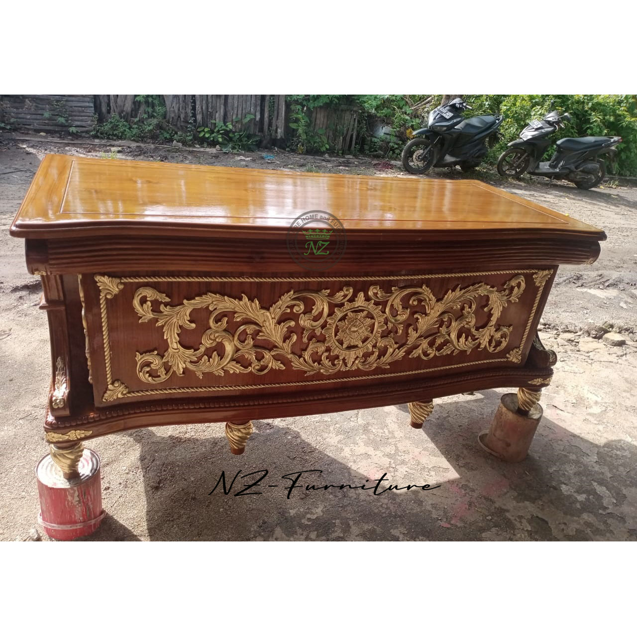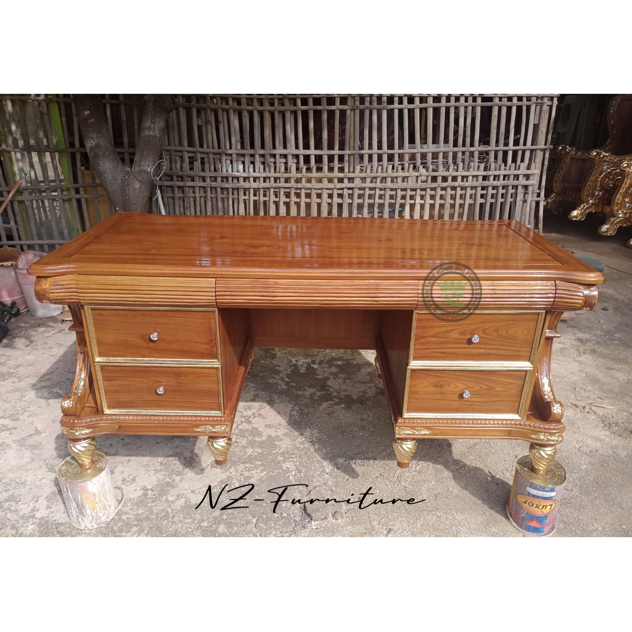 Meja Kantor Love Collection adalah gaya, keindahan, dan kenyamanan yang halus. Terbuat dari kayu jati solid, buatan tangan dari pengrajin jepara dengan warna walnut dengan aplikasi daun emas dan tuju laci membuat meja ini sangat lengkap untuk menyimpan dokumen penting Anda.
