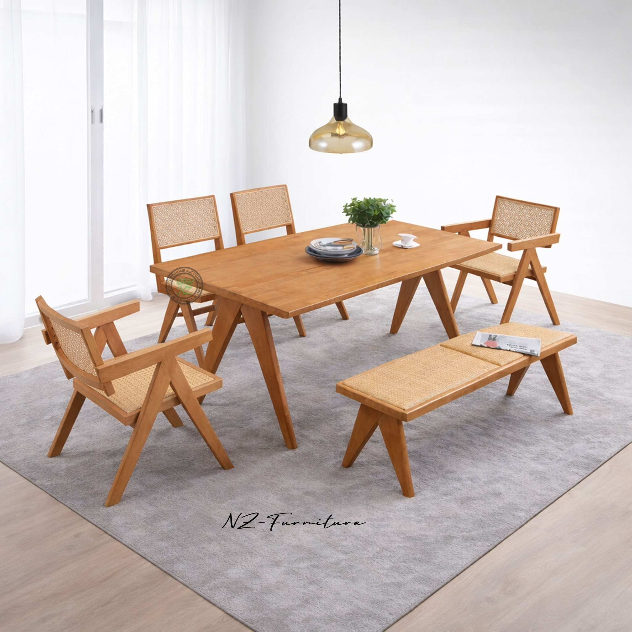 The NZ Scandinavian Teak Dining Set is a perfect blend of minimalist design and natural elegance. Crafted from 100% solid teak wood, this dining set highlights beautiful wood grain with a natural matte finish, creating a warm and timeless look.