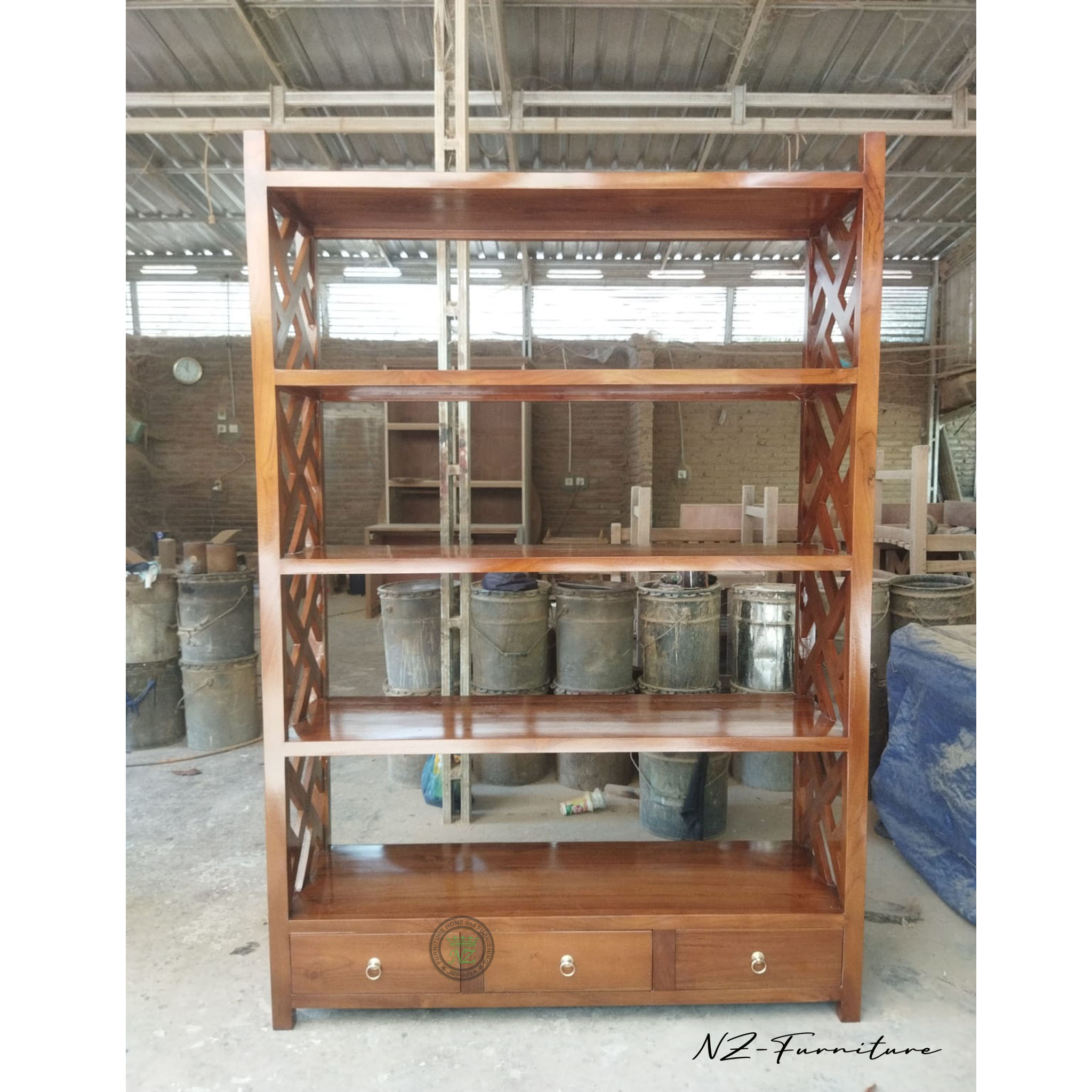 Warna cat finishing rak pada gambar display di atas memakai warna natural menampilkan kesan alami dan serat kayu jati menambah kesan nuansa pedesaan yang hangat.